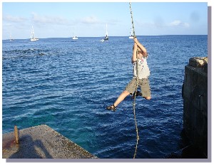 The main town and anchorage of Niue was a beautiful sight. The steep cliffs provided a nice backdrop to yet another friendly town. The dinghy dock consists of an extremely tall concrete supply ship dock, that in order to go ashore one must use a crane to lift your dinghy out. The boys also found it great fun to practice their swinging skill on the line.