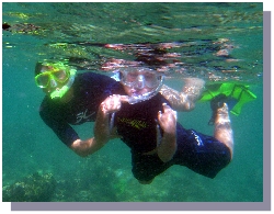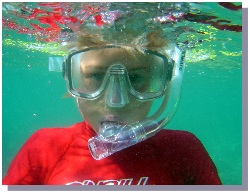 We dodged and weaved our way directly in to the fuel dock to fill our tanks and dump our garbage. Then we headed back into the bay to anchor. Because of the currents here a stern anchor was needed which lined us up nicely with a few other boats in the anchor. Bruce went out to place a buoy on the anchor to mark it's location for safety and it quickly became a slolom marker for all these boats. Not the idea we had in mind. The water was a wonderful 75 - 77 degrees and despite the busy boats we jumped right in to play.