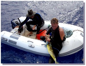 The men were busy hard at work trying to recover our anchors. Ross from Kabuki, the ultimate extreme fisherman, taught us the meaning of the word "focus" as he brought his pole along for the anchor retrieval and they brought home many a fish. It did end up taking 3 full tanks of air and all three guys to get up our anchors.