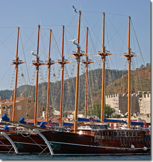 We headed back east, instead, to the safe haven of Marmaris, Turkey. A large and beautiful basin of water nearly entirely surrounded by high rock mountains and covered with pine trees to the waters edge. The northern shore is covered as well by hotels and night life hot spots which helps to give the location it's name of the Turkish Rivera. The tourist industry involves a large fleet of handsome gullets, which are larger than life wooden sail boats that take out large charters groups for day sails and trips around the waters.