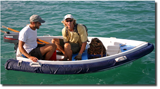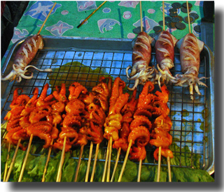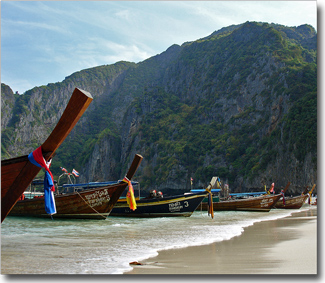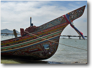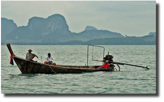 Sailing around the turquoise yet murky waters of Phuket took a bit of getting used to since we never saw depths greater than 3 meters shallow. Strange when you can't ever see the bottom. We did find it a few times with the keel as we tried to "feel" our way over some sand bars. What better way to knock off those pesky barnacles. The more traditional "longtail" boats will come by in the evenings and offer their catch for the day be it fish or shrimp. Notice the LONG weed whacker of a shaft leading to their propeller. They make quite a sound as well. |
