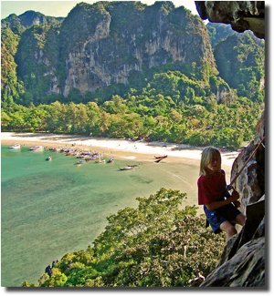 Railay is also home to some world famous rock climbing. It was the perfect opportunity to drag out, dust off our own climbing harnesses and give them the chance to be put to their intended use, not their more frequent task of climbing up the mast. Best of all it gave us a chance to introduce Tristan, Matthew and the Kelly's to this new and exciting experience. There is nothing like challenging yourself to new limits and then be able to look back out across the ocean and sweeping views from a new point of view.