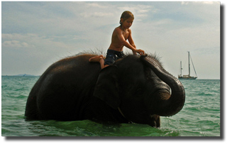 Last but not least, we heard that there was a baby elephant, just up the road in Krabi, that like to take a walk on the beach everyday and play in the water. Who could pass that up. Matthew, Tristan and their pal Soleil from s/v Luna didn't waste a second feeding bananas to, climbing on, sliding off, swimming with and bathing this 5 year old pachyderm. An experience to last them a lifetime. |