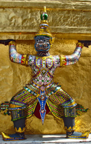 Wat Phra Kaew also known as Temple of the Emerald Buddha, compete with gleaming jehdii (stupas),which are mosaic color glass encrusted pillars. Guarded by two mythical giants, yaksha's, the nearly 95 hectare grounds hold over 100 buildings demonstrating 200 years of royal history.