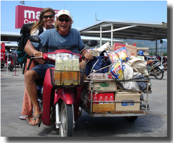 Getting around Phuket was generally easy in tuk tuks which are slow, inexpensive open air taxi's of sorts. We much preferred being the masters of our own destinies, (i.e. taking our lives into our own hands) while honing our scooter skills and taking on round abouts with hundreds of our new Thai neighbors. It added a whole new dimension when it came time to provisioning, note the side car. You can pack quite a lot of food into one of those, though you feel like you are always going to turn left. The trick was getting it back into the dinghy, across that bay and back to the boat. There is also the art of of washing the bugs off each piece of produce, repackaging each pound of meat, and rebagging anything packaged in cardboard which houses cockroaches and their eggs. Then there is the small detail of finding a home for everything.