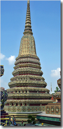 Much of grounds hold other Buddhas and places for worship, incense and cleverly folded lotus flowers everywhere. Rising high into the sky are many more stupas entirely covered again with amazing mosaics of tiles and colored glass that create a shimmering spire reaching for the heavens or nirvana I suppose. The remains of King Rama III can be found in the larger ones with the sons in the smaller ones.