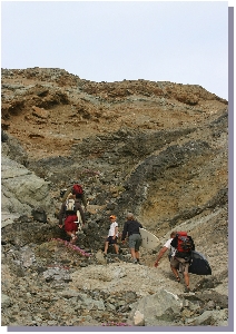 The crew above from the boat Float On consisting of Garrett, Steve and Daniel were the ones who unfortunately were hit by the panga in San Juanico. They repaired their damages and we found them again in Santa Maria. The let us know of a great hike over the point that led to this location for surfing. Along the hike we were treated to cactus flowers in bloom, wild bee hives and breath taking views. Below is a look at just how dedicated these surfers can be, hiking hill and dale to find nirvana. |